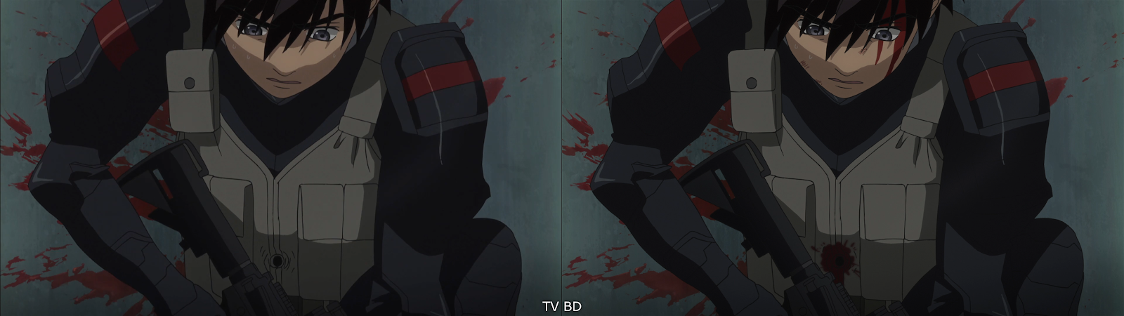 Full Metal Panic! Invisible Victory ins now fully available on Blu Ray in Japan. Here are some comparison shots from the BluRay and TV version. In general the BluRay image is slightly darker than the TV version and looks sharper due to less compression. Major changes were made to episode 6, 8, 9, 10 and 12 with some smaller changes done throughout the season. This list is incomplete as there are many more shots that were also improved. Whenever there is a new shot it usually replaces one that was already used at a different point of that episode.
